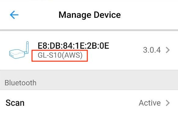 To identify if your GL-S10 is running the AWS IoT firmware, navigate to the Manage Device page of the GL-S10 Tool App. If the model has AWS at the end, it indicates that the device is using the AWS IoT firmware.