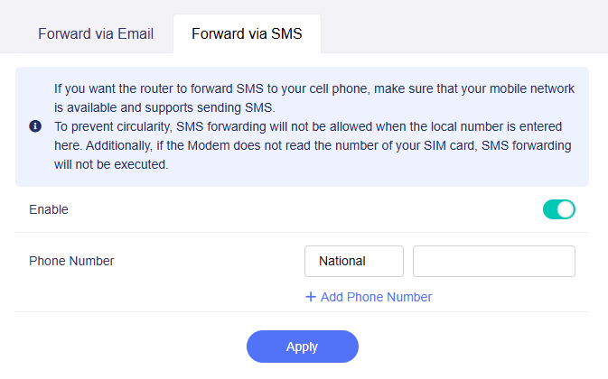 On the left side of web Admin Panel -> INTERNET -> Cellular section. Click the envelope icon in the upper right to enter SMS page, and you will find the SMS Forwarding settings.